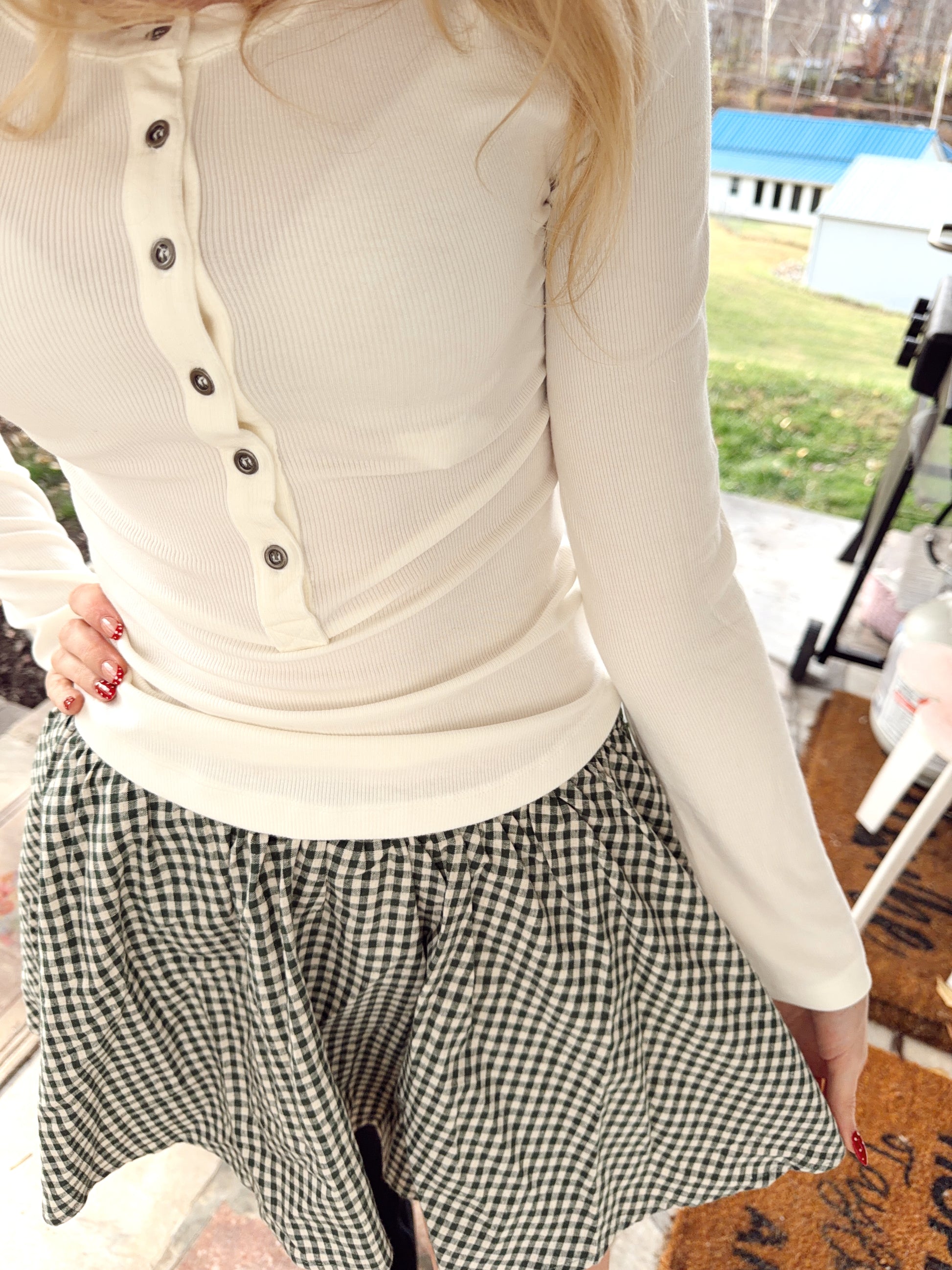 This adorable gingham skirt has shorts underneath it! Hailey is 5’6, 105lbs and wearing a small.