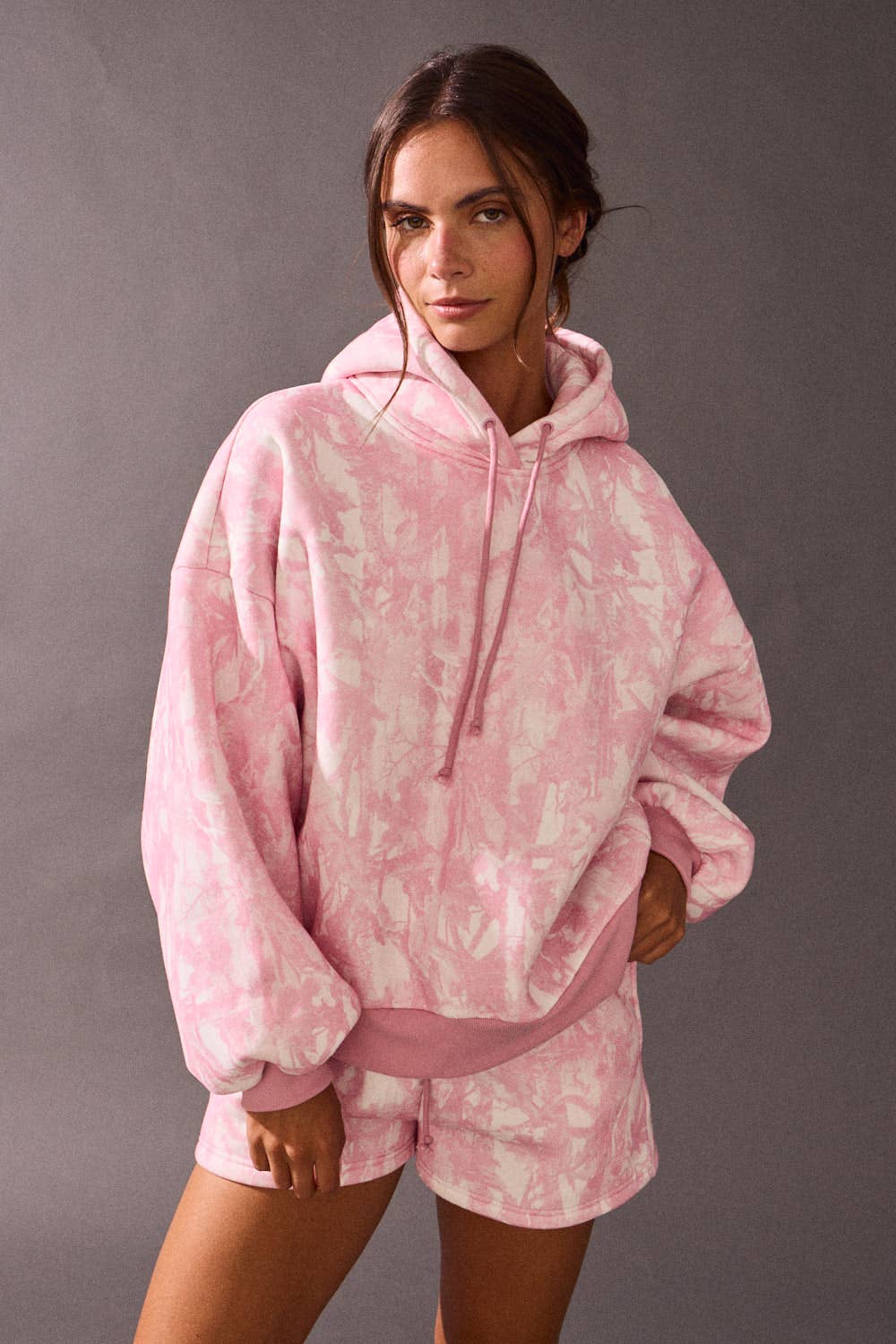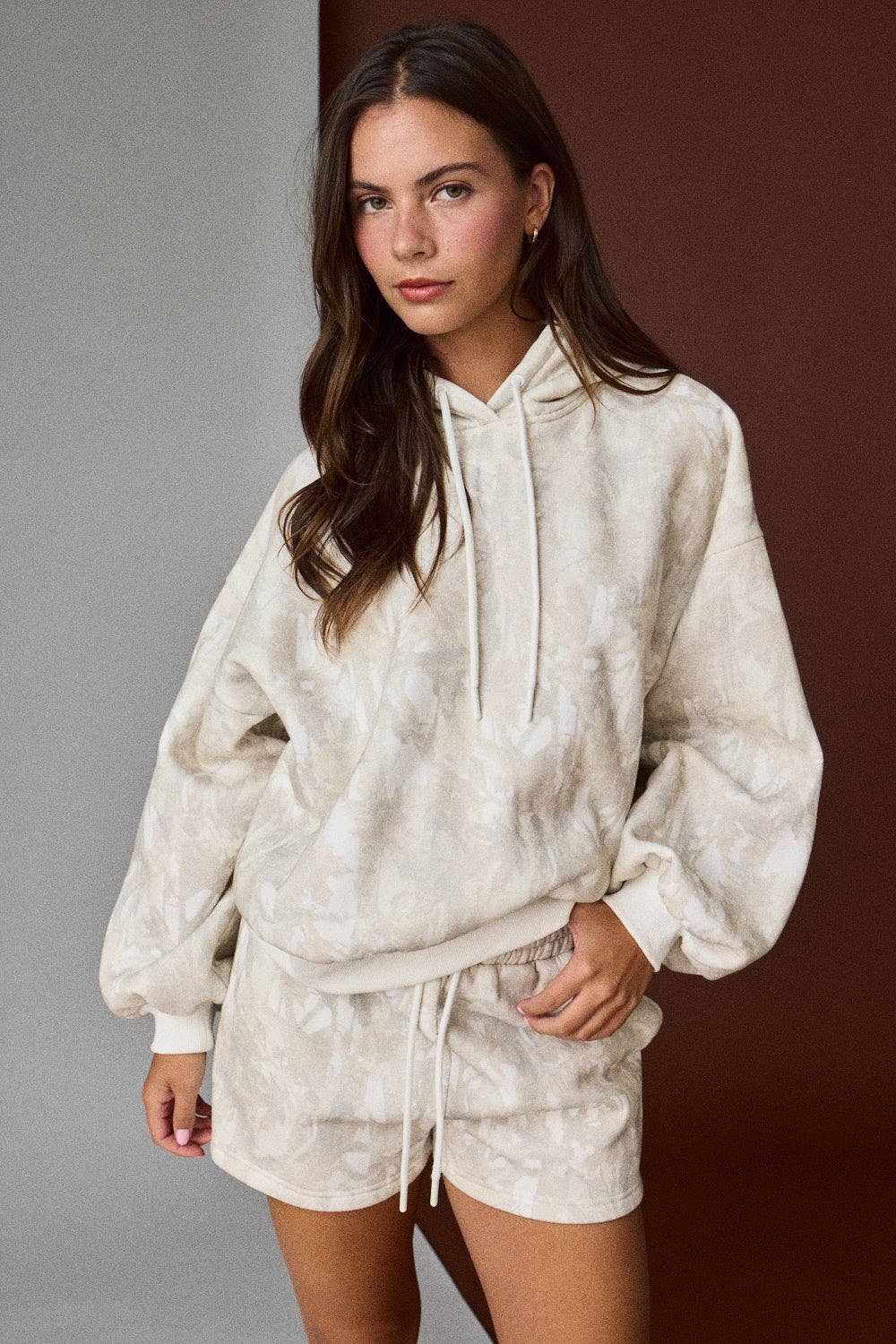 Laid-back days just got cuter. This woodland camo lounge set features an oversized hoodie with a relaxed fit, drawstring hood, and ribbed cuffs — paired with matching shorts that have an elastic waistband and adjustable tie for all-day comfort. The soft pink camo wash adds a subtle pop of color while keeping things neutral and easy to wear.